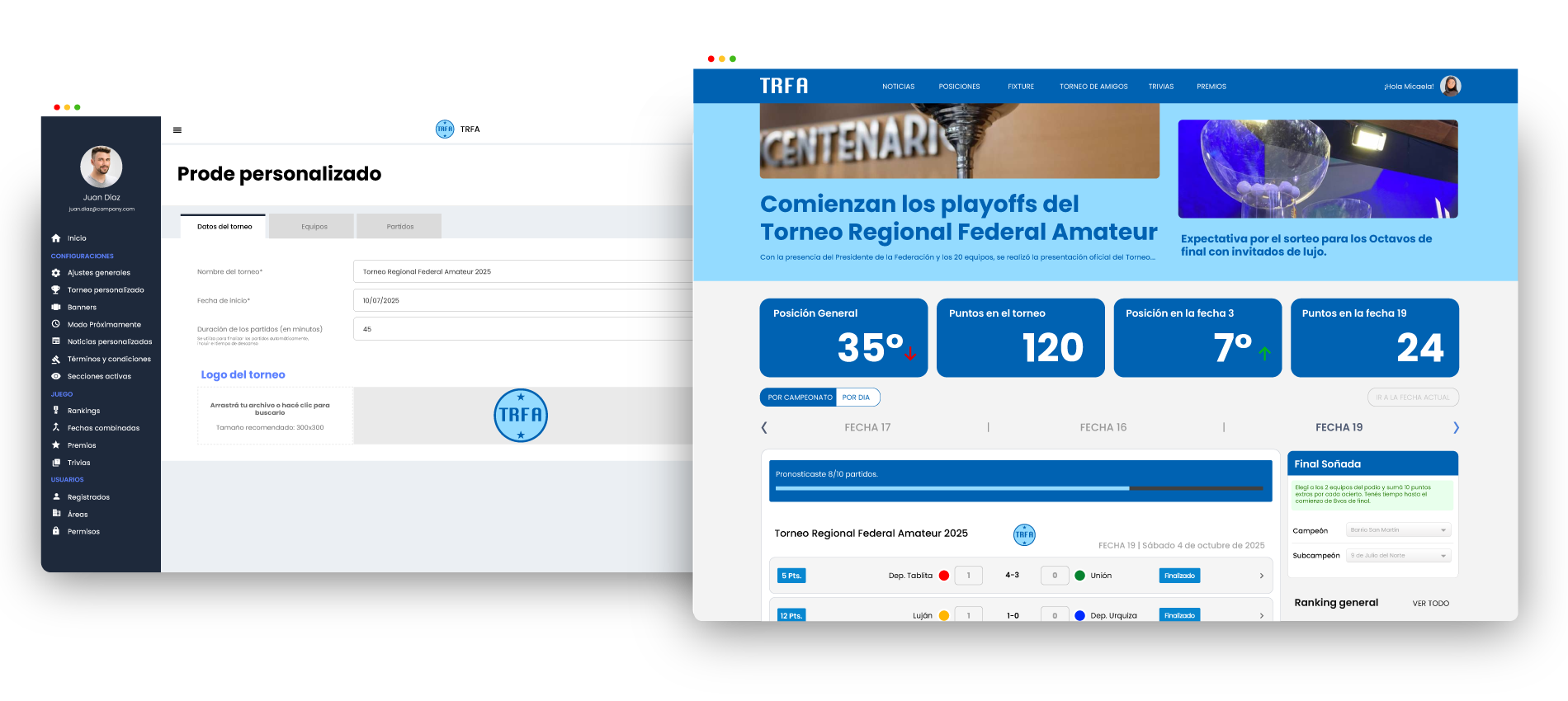 Tendrás la posibilidad de subir tus propias novedades o vincular tu cuenta con portales deportivos (RSS) para visualizar automáticamente noticias del torneo en juego.